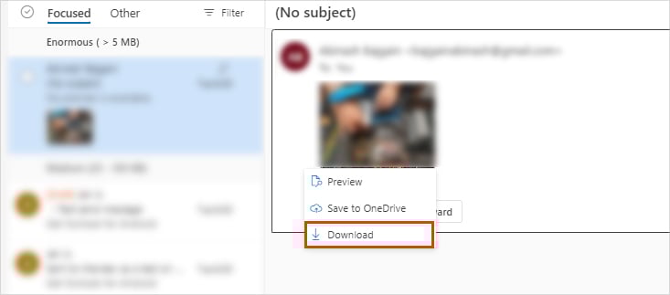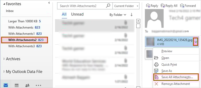 Het bovenstaande proces kan berichten met bijlagen verwijderen. Dus als u de bijlage wilt behouden zonder de mailbox te vergroten, kunt u deze downloaden op uw lokale computer. Plaats hiervoor