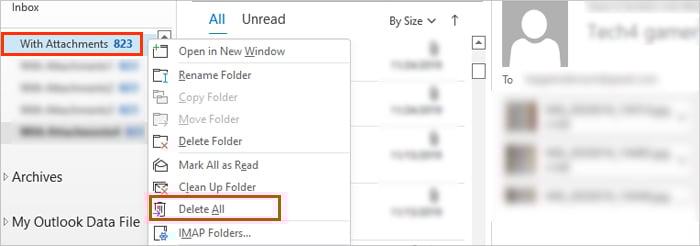 Maar als u een groot aantal onnodige e-mails met grote bijlagebestanden hebt, kunt u ze allemaal tegelijk leegmaken. Vouw hiervoor de vervolgkeuzelijst Zoekmappen in de linkerzijbalk uit en klik met de rechtermuisknop op de map Met bijlagen. Selecteer vervolgens de optie Alles verwijderen om al die bijlagen uit uw mailbox.