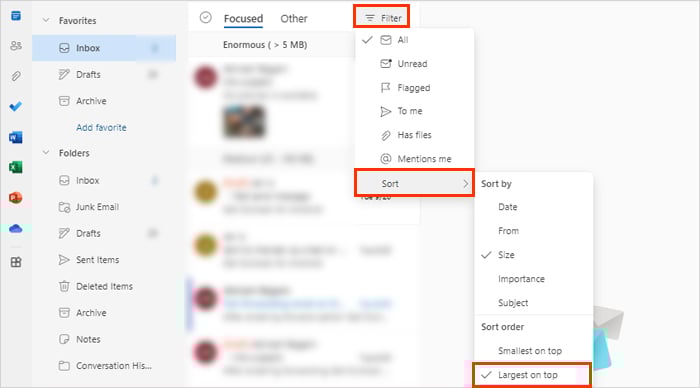 Meld u aan bij uw Outlook-account en klik op de map Inbox.Klik vervolgens op Filter bovenaan de berichten. Selecteer Sorteren > Formaat en kies de optie Grootste bovenaan onder Sorteervolgorde.
