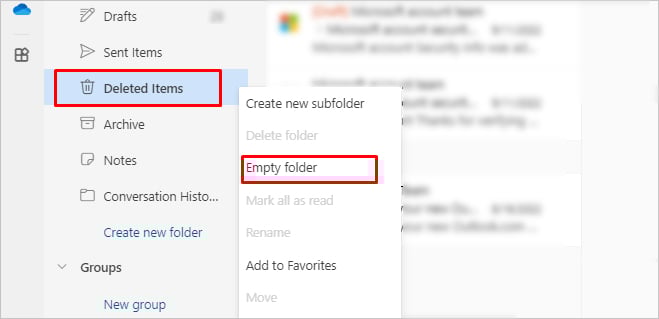 Klik anders met de rechtermuisknop op de map Verwijderde items en selecteer de optie Map leegmaken.