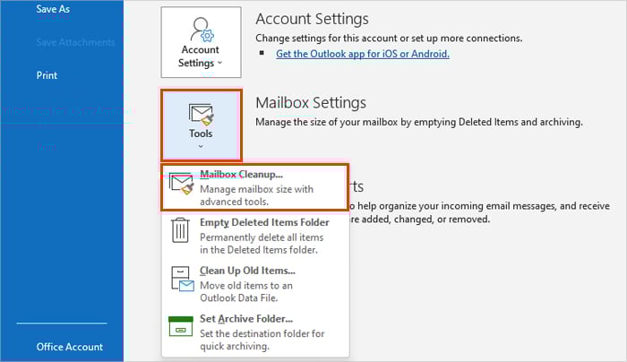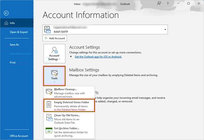 Open de Outlook-app en navigeer naar Bestand > Info. Klik vervolgens in het rechterdeelvenster op Extra en selecteer de Map met verwijderde items leegmaken optie.Klik op Ja om alles in de map Verwijderde items te verwijderen. Start Outlook opnieuw en kijk of uw mailbox leeg.