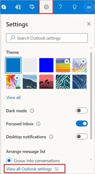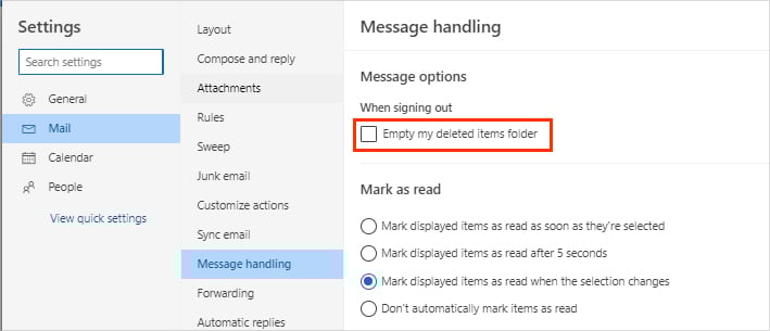 Nadat u zich heeft aangemeld bij uw Outlook-account, klikt u op het tandwielpictogram in de rechterbovenhoek van het venster. Klik vervolgens op Alle Outlook-instellingen weergeven onderaan. Navigeer vervolgens naar Mail > Berichtverwerking. Schakel in het gedeelte Berichtopties het selectievakje Map met verwijderde items leegmakenin.