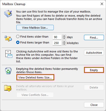 Outlook heeft een ingebouwde tool genaamd Mailbox Cleanup die helpt om de grootte van je mailbox te verkleinen. Hiermee kunt u de items wissen die nog in de map Verwijderde items staan.