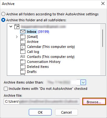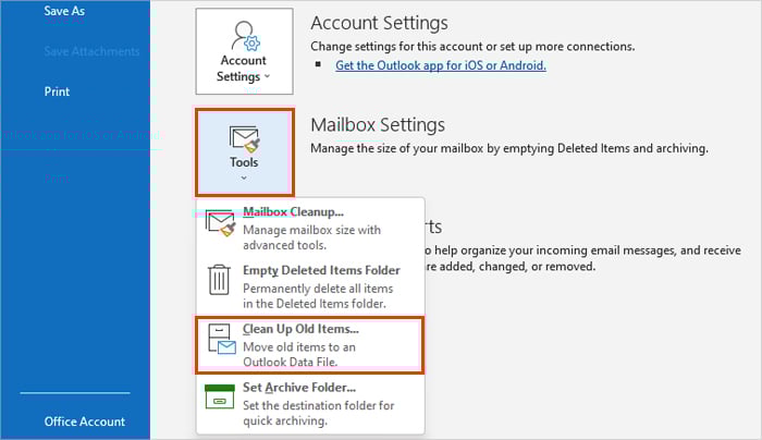 Navigeer naar Bestand > Info. Klik op Extra en selecteer de optie Oude items opschonen.Selecteer vervolgens alles wat u wilt archiveren volgens uw voorkeuren. U kunt zelfs berichten kiezen die ouder zijn dan een bepaalde datum. Klik nu op de knop Bladeren onder het gedeelte Archiefbestand en kies een gewenste bestandslocatie.