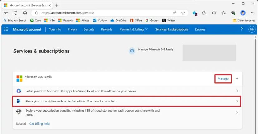 Klik op Beheren optie voor de instelling’Microsoft 365 Family’.
