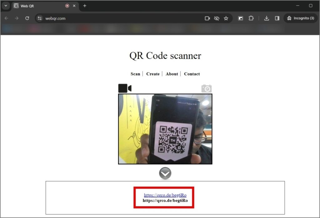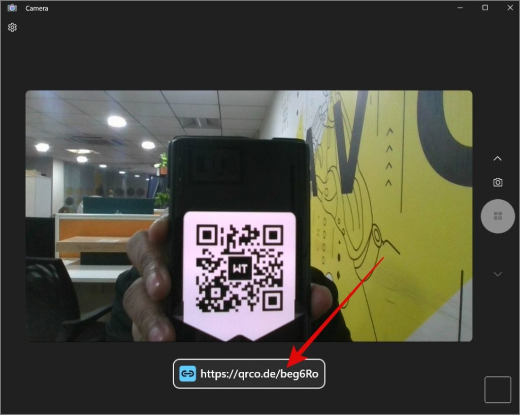 2. Daarna Wijs daarvoor op de QR-code voor de webcam. Zodra de scan is voltooid, wordt de URL of link van de webpagina weergegeven.