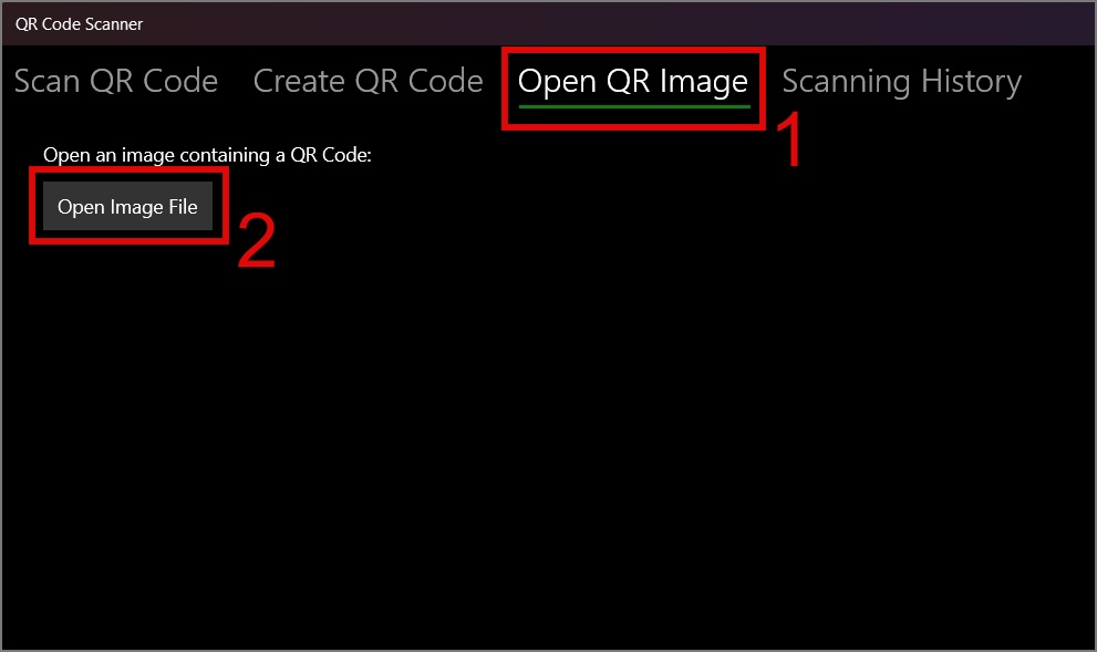 2. Als u klaar bent, opent u de app en gaat u naar het tabblad QR-afbeelding openen. Klik daarna op de knop Afbeeldingsbestand openen.