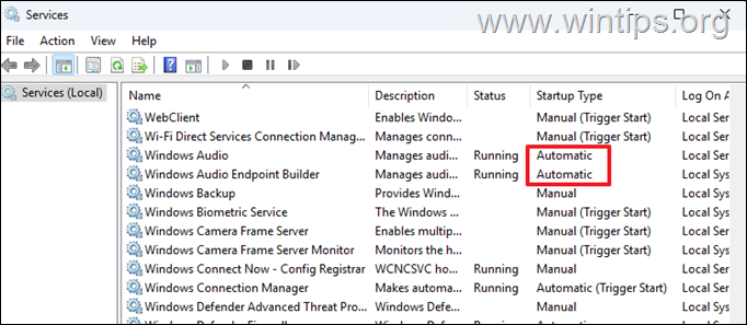4a. zorg ervoor dat het starttype van de volgende drie (3) services is ingesteld om te automatisch automatisch .. (If not, double-click the service and change the startup type to”Automatic”)