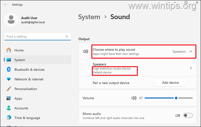 2. op de out , zorg ervoor dat de is om audio te spelen. standaard. Als dit niet het geval is, selecteert u het juiste audio-apparaat en test u het geluid om de functionaliteit te bevestigen.