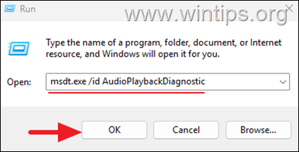 2. kopiëren en plakken de onderstaande opdracht om de”Playing Audio”te openen”MSDT. Audioplaybackdiagnostic