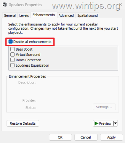 3. scroll de set audio-verbeteringen off de sound opnieuw, test de sound opnieuw, test de sound opnieuw. en als het probleem aanhoudt, re-engable audio-verbeteringen en doorgaan naar de volgende methode.