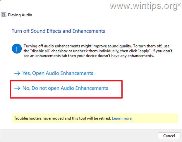 * Opmerking: als het audioprobleem blijft bestaan, opent u de probleemoplosser opnieuw, maar selecteer deze keer nee, open geen audioverbeteringen en laat Windows om het probleem op te lossen.