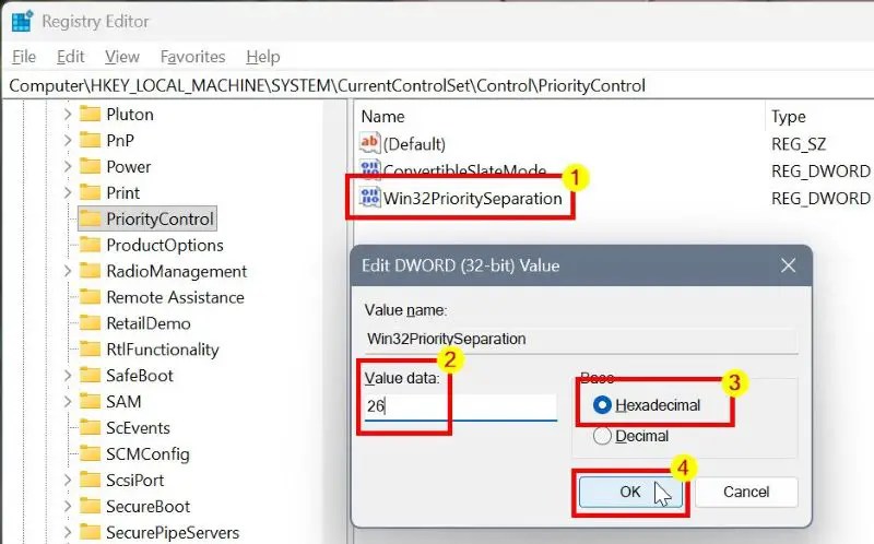 HKEY_LOCAL_MACHINE\SYSTEM\CurrentControlSet\Control\PriorityControlDubbelklik op de waarde’Win32PrioritySeparation‘. Vervang de huidige waarde in Waardegegevens door’26‘. Selecteer’Hexadecimaal‘en klik op’OK‘.Sluiten de Register-editor.Start uw computer opnieuw op. Daarmee worden de spelprestaties en FPS verbeterd.