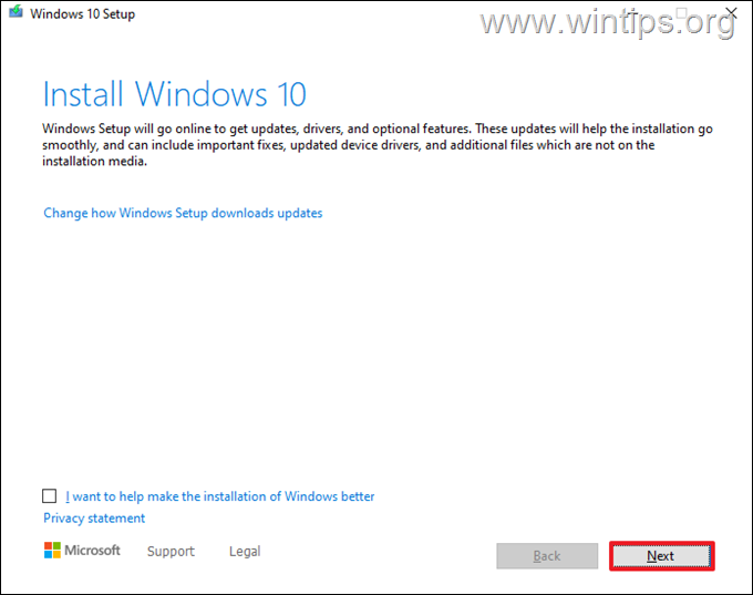 2. Klik in het scherm’Windows 10 installeren’op Volgende.