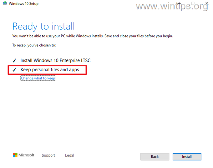 4. Zorg er ten slotte voor dat op het volgende scherm de optie”Persoonlijke bestanden en apps bewaren”* is aangevinkt en klik op Doorgaan om Windows 10 te installeren Enterprise LTSC terwijl bestanden en apps behouden blijven.
