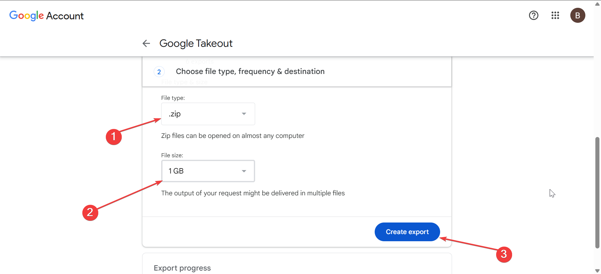Kies vervolgens .zip als het formaat voor eenvoudige extractie op Windows. Kies een archiefgrootte, zoals 2 GB, 10 GB of 50 GB. Klik hier op’Export maken’ en wacht tot u een e-mail ontvangt waarin staat dat uw export gereed is.
