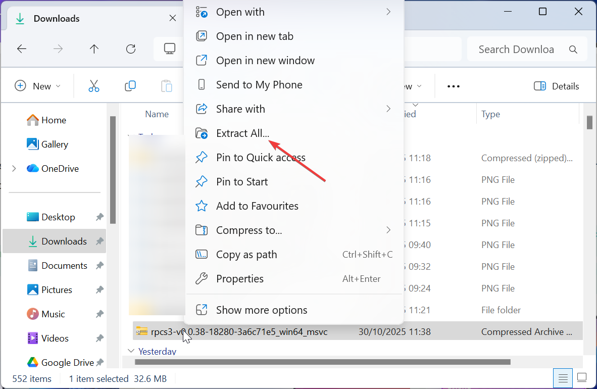 Bezoek de officiële RPCS3-site en download de nieuwste Windows-build. Klik met de rechtermuisknop op de map en selecteer Alles uitpakken. Klik vervolgens op de knop Uitpakken in de volgende pop-up om de bestanden uit te pakken.