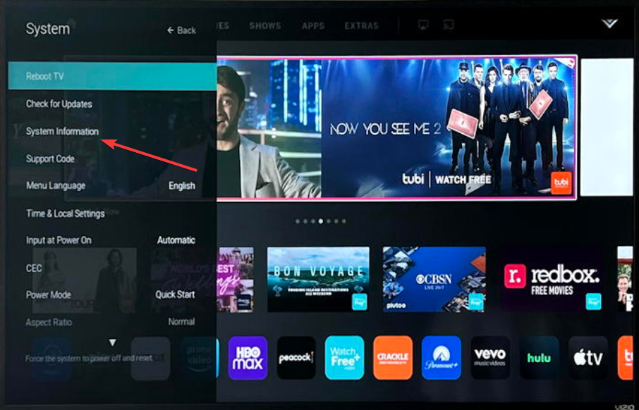 Om te controleren of de firmware van uw tv aanwezig is, pakt u uw Vizio-afstandsbediening en drukt u op de menuknop. Selecteer Systeem > Systeeminformatie om uw modelnummer en firmwareversie te bekijken.