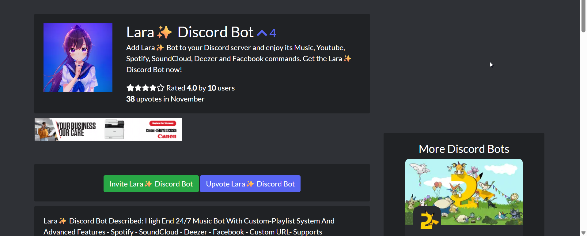 Lara is een moderne muziekbot die is ontworpen om 24/7 afspeelmogelijkheden te bieden met brede platformondersteuning. Of je nu streamt vanaf Spotify, SoundCloud of Deezer, Lara biedt uitstekende integratie met deze platforms.