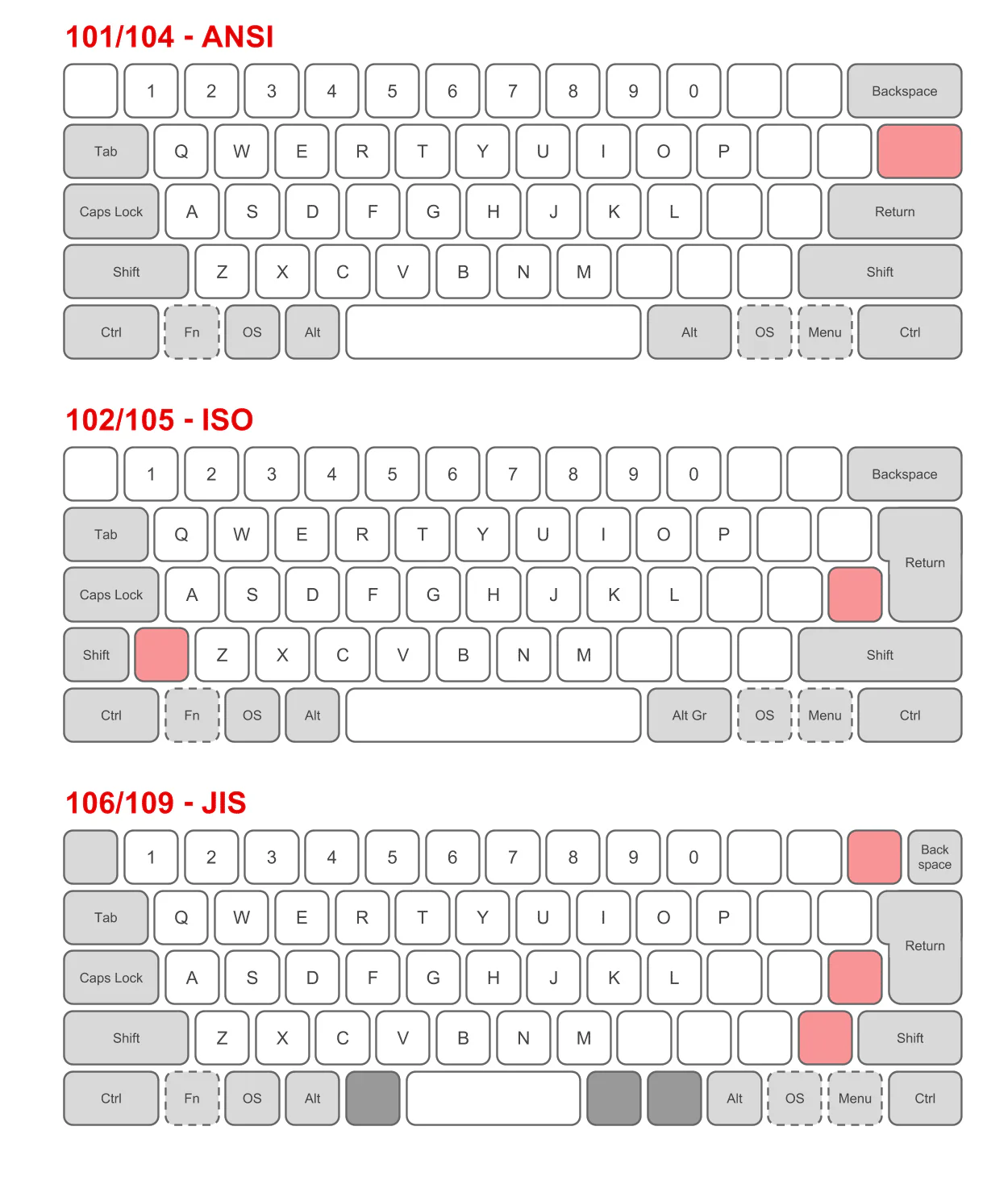 De drie belangrijkste regionale lay-outs verklaren de meeste verschillen in sleuteltellingen. Meestal ziet u ze vermeld als ANSI-toetsenbordindeling, ISO-toetsenbordindeling en JIS-toetsenbordindeling. Ze behouden allemaal hetzelfde basisidee, maar verplaatsen of voegen toetsen toe om verschillende talen te ondersteunen.