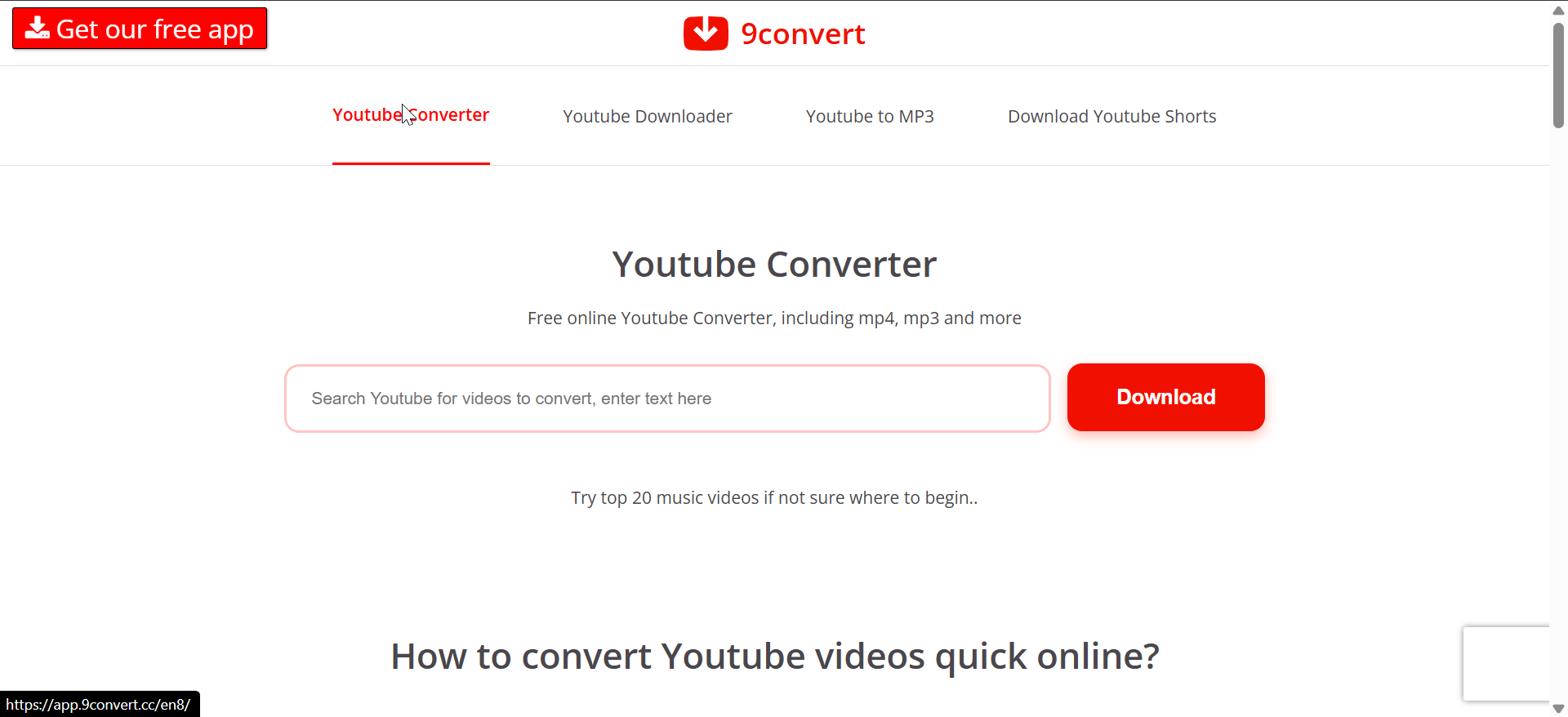 9Convert levert hoge laadsnelheden en een modern ontwerp. Je plakt je YouTube-link en ziet vrijwel onmiddellijk de resolutiekeuzes. De site ondersteunt HD-downloads voor de meeste video’s.