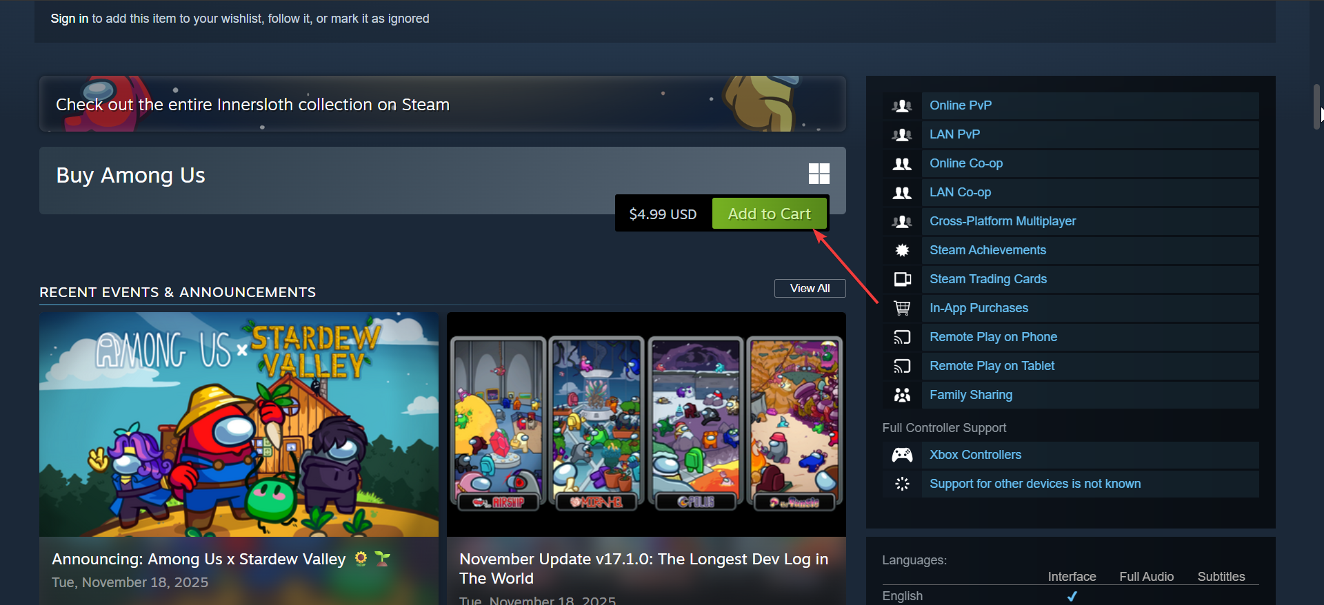 Open de Steam-client op uw pc en selecteer bovenaan Opslaan. Typ Among Us in de zoekbalk, klik op het spel in de resultatenlijst, selecteer Toevoegen aan winkelwagen en rond het afrekenen af.