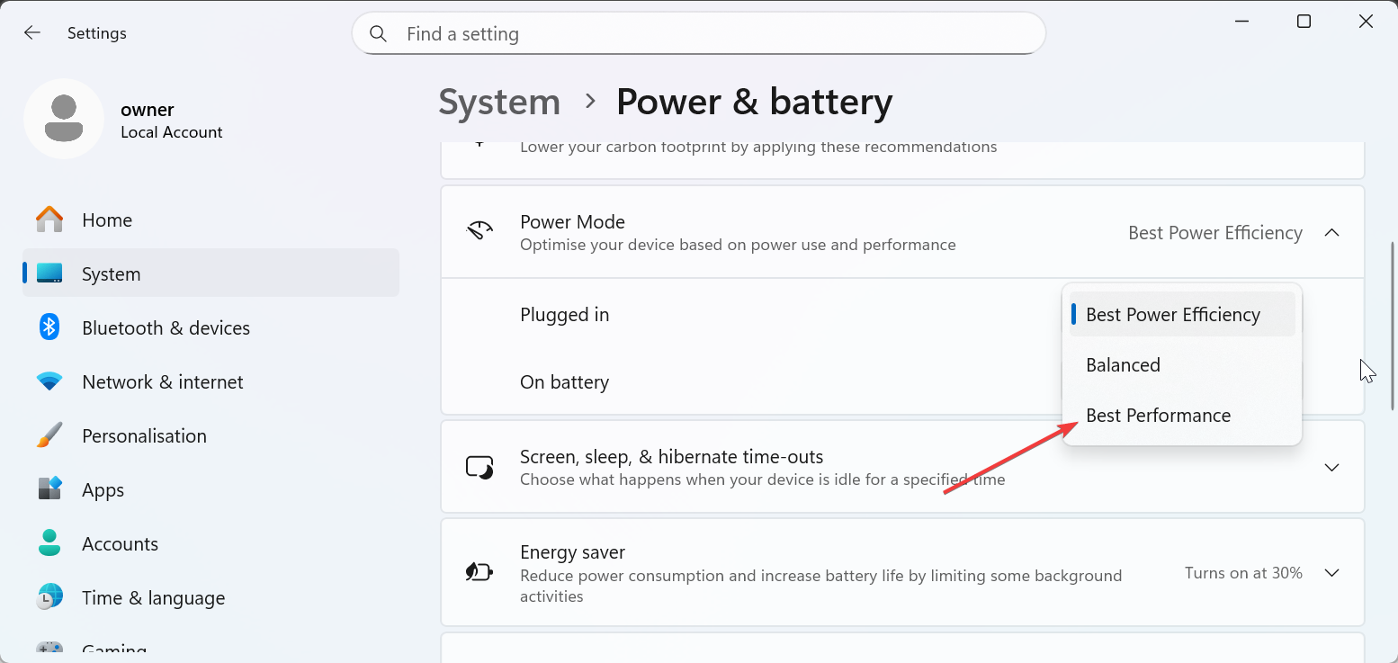 Ga naar Instellingen > Systeem > Energie en batterij > Energiemodus en kies Beste prestaties voor de twee opties eronder. Dit voorkomt dat de CPU wordt beperkt tijdens zware gameplay.