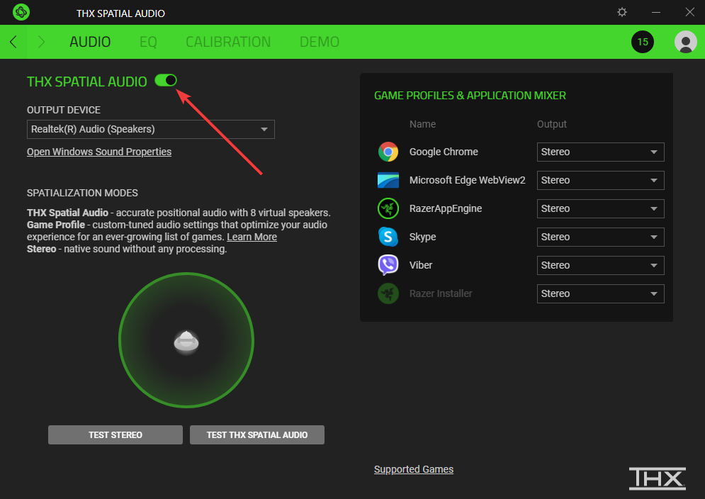 Hoe schakel ik ruimtelijke audio in? Activeer THX of 7.1 surround in Synapse en selecteer dit als het standaard ruimtelijke formaat.