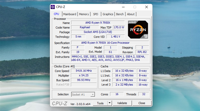 AMD Ryzen 9 7950X-specificaties zoals weergegeven door CPU-Z