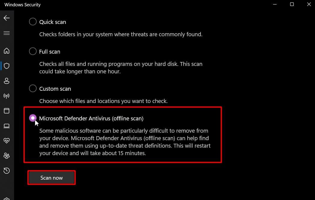 Selecteer Microsoft Defender Antivirus (offline scan) en druk op de Knop Nu scannen.