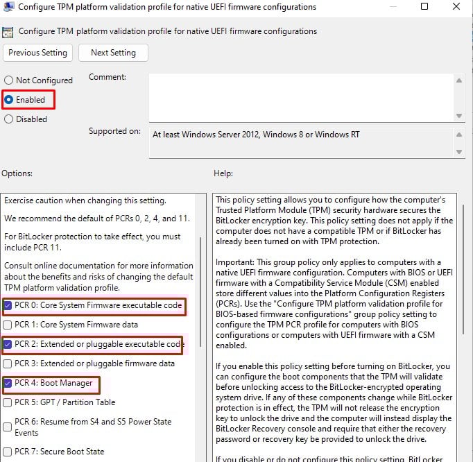 Klik aan de rechterkant op TPM-platformvalidatieprofiel configureren voor systeemeigen UEFI-firmwareconfiguraties