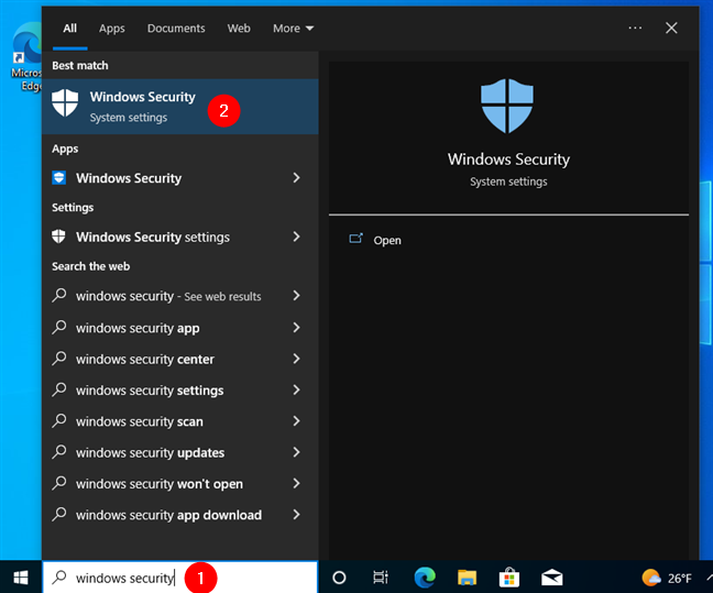 Typ in Windows 10″windows security”in het zoekveld op de taakbalk en klik of tik vervolgens op het juiste zoekresultaat.