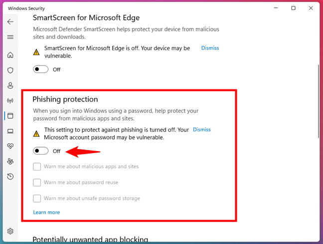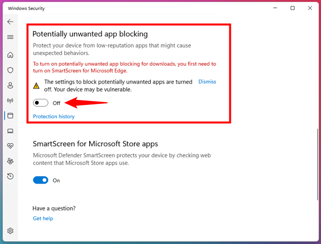 Vervolgens is er de instelling”Potentieel ongewenste app-blokkering”. Dit is een functie van Microsoft Defender SmartScreen die”uw apparaat beschermt tegen apps met een lage reputatie die onverwacht gedrag kunnen veroorzaken.”Schakel de schakelaar uit om deze uit te schakelen.