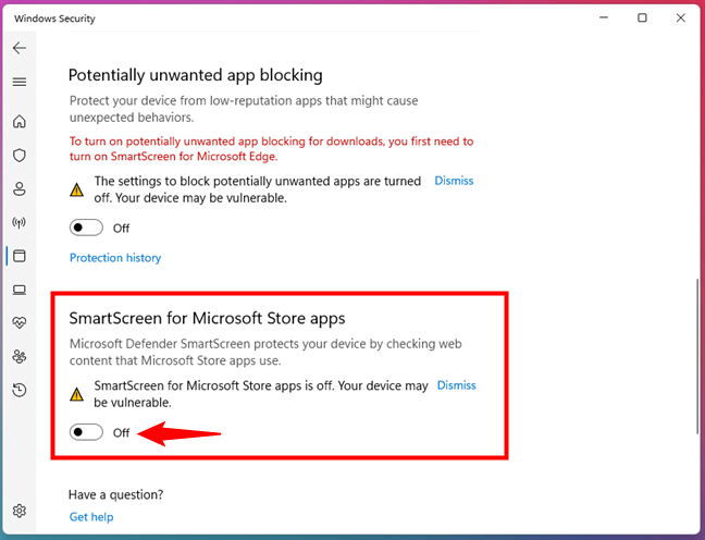 En last but not least, de laatste instelling voor Microsoft Defender SmartScreen heet”SmartScreen voor Microsoft Store-apps”. Deze”[…] beschermt uw apparaat door webinhoud te controleren die Microsoft Store-apps gebruiken.”Schakel nogmaals de schakelaar uit om deze uit te schakelen.