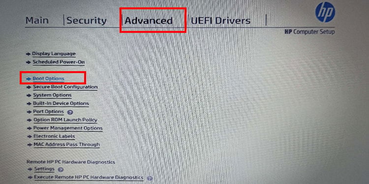 De pijl gebruiken toetsen, ga naar Geavanceerd en selecteer vervolgens Opstartopties.