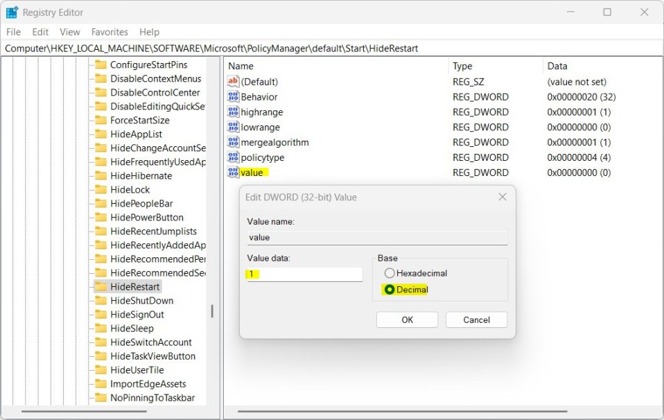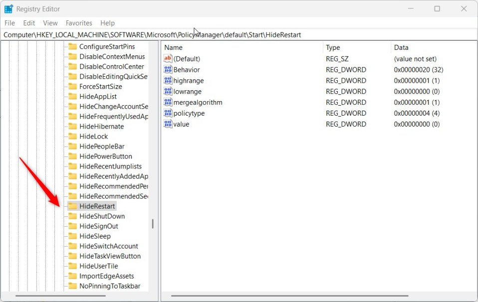 HKEY_LOCAL_MACHINE\SOFTWARE\Microsoft\PolicyManager\default\Start\HideRestart
