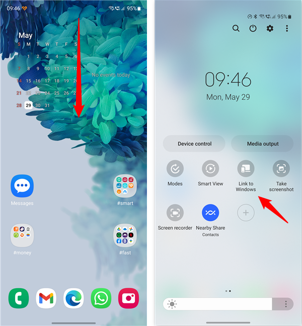 Samsung Galaxy-enheter kommer med Link til Windows som en innebygd funksjon. For å begynne å bruke den, på din Samsung Galaxy-smarttelefon, sveip ned fra toppen av skjermen for å få tilgang til hurtiginnstillinger. Sveip ned igjen for å åpne den utvidede Hurtiginnstillinger-menyen, der du kan finne «Link to Windows»-knappen. Hvis du trykker på den, aktiveres funksjonen mens du trykker og holder den for å åpne innstillingene. Siden dette er første gang du kobler til din Samsung Galaxy til Windows-PCen din, sørg for at du trykker og holder inne Link til Windows-knappen for å konfigurere appen.
