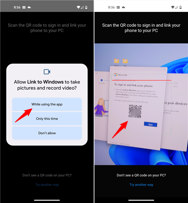 Link til Windows ber deg om å la den ta bilder og spille inn video på Android-enheten din. Trykk på «Mens du bruker appen» og pek kameraet mot QR-koden som vises på Windows-datamaskinen.