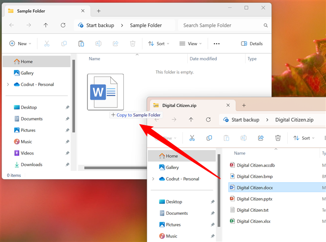For å begynne, bruk Filutforsker til å åpne den komprimerte filen, bla gjennom innholdet , og velg filen(e) og/eller mappe(r) du vil pakke ut. Deretter kopierer eller klipper du inn og limer inn den(e) valgte filen(e) til en annen mappe på din Windows 11-datamaskin. Du kan også dra og slippe én eller flere filer fra arkivet til en annen mappe, som vist på følgende skjermbilde.