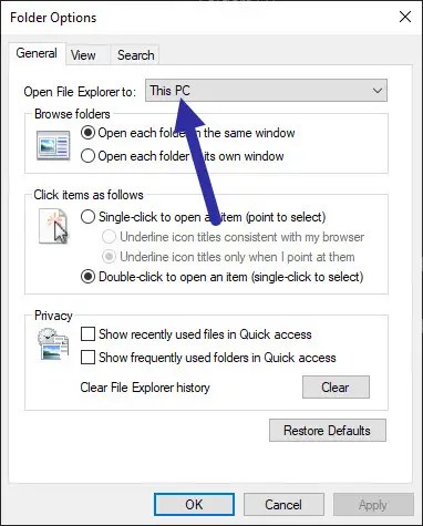 Åpne Filutforsker med”Windows-tasten + E“. Klikk på”Vis“-fanen. Klikk på”Alternativer“-knappen. Gå til”Generelt”-fanen”“fra Filutforsker til”rullegardinmenyen. Klikk”OK“for å lagre endringen. Med det åpnes Filutforsker til denne PC-en.