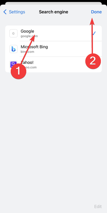 2) Sett Google på telefonen som standard på Android og iPhone, trykk på tre som standard på Android og iPhone. prikker (øvre høyre hjørne for Android og nedre høyre hjørne for iPhone). Velg nå Innstillinger og trykk på søkemotoralternativet. Til slutt velger du Google fra listen og trykker på Ferdig.