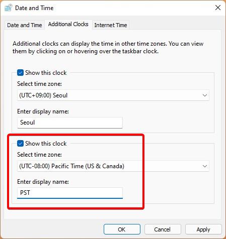 For å legge til en annen klokke, velg den andre”hvordan”-boksen, velg den andre boksen, navn.