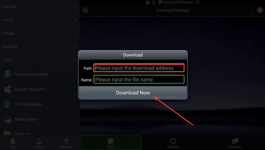 Deretter åpner du appen og i ES File Explorer velger du Nedlastingsbehandling → Ny og limer inn Live Net TV APK-koblingen. Velg Last ned nå. Du kan også overføre APK-en fra datamaskinen din via skylagring hvis du foretrekker det.