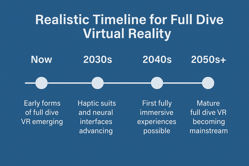 Virtuell virkelighet med full dykk er fortsatt et av de mest ambisiøse målene innen oppslukende teknologi. Nåværende fremskritt innen nevrovitenskap, haptikk og AI antyder at delvis nevral nedsenking vil dukke opp først, etterfulgt av prototype full-dive-systemer i spesialiserte industrier. Forbrukerklare versjoner krever tiår med sikkerhetstesting, regulering og kostnadsreduksjon.