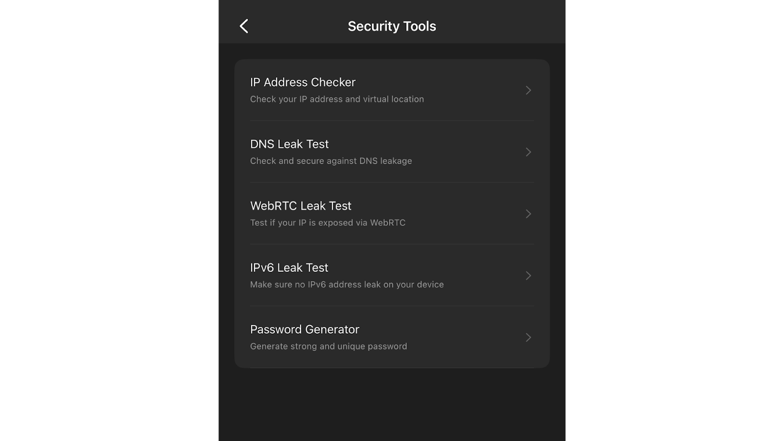 WebRTC-lekkasjetest – Sjekker om nettleseren din lekker IP-adressen din gjennom WebRTC-applikasjoner, som i nettleseren eller mobilapper for lyd-og videochatte. Svakere VPN-er klarer ikke å plugge dette sikkerhetsproblemet.