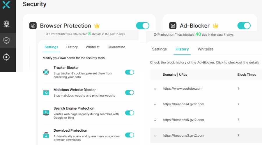 X-VPN takler dette på Windows og macOS med nettleserbeskyttelse og annonseblokkering. Slå disse på under Sikkerhet-fanen, og appen vil blokkere farlige nettsteder, søkeresultater, nedlastinger og filer.