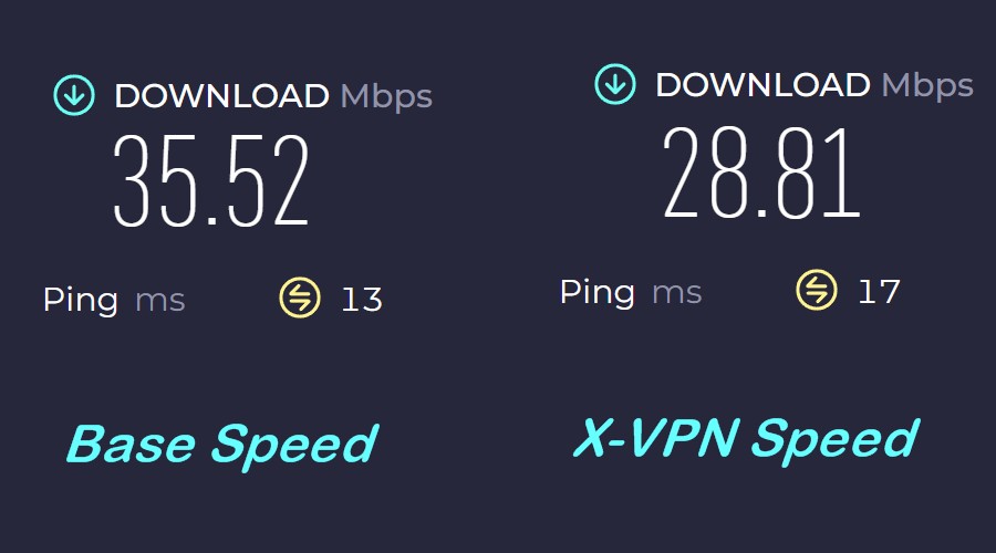 I testene våre gir X-VPN gode resultater, noe som resulterer i bare 19 % reduksjon i hastighet sammenlignet med baseline når den er koblet til den raskeste serveren via WireGuard-protokollen. Dette var omtrent 22 % når det var koblet til en server på den andre siden av verden.