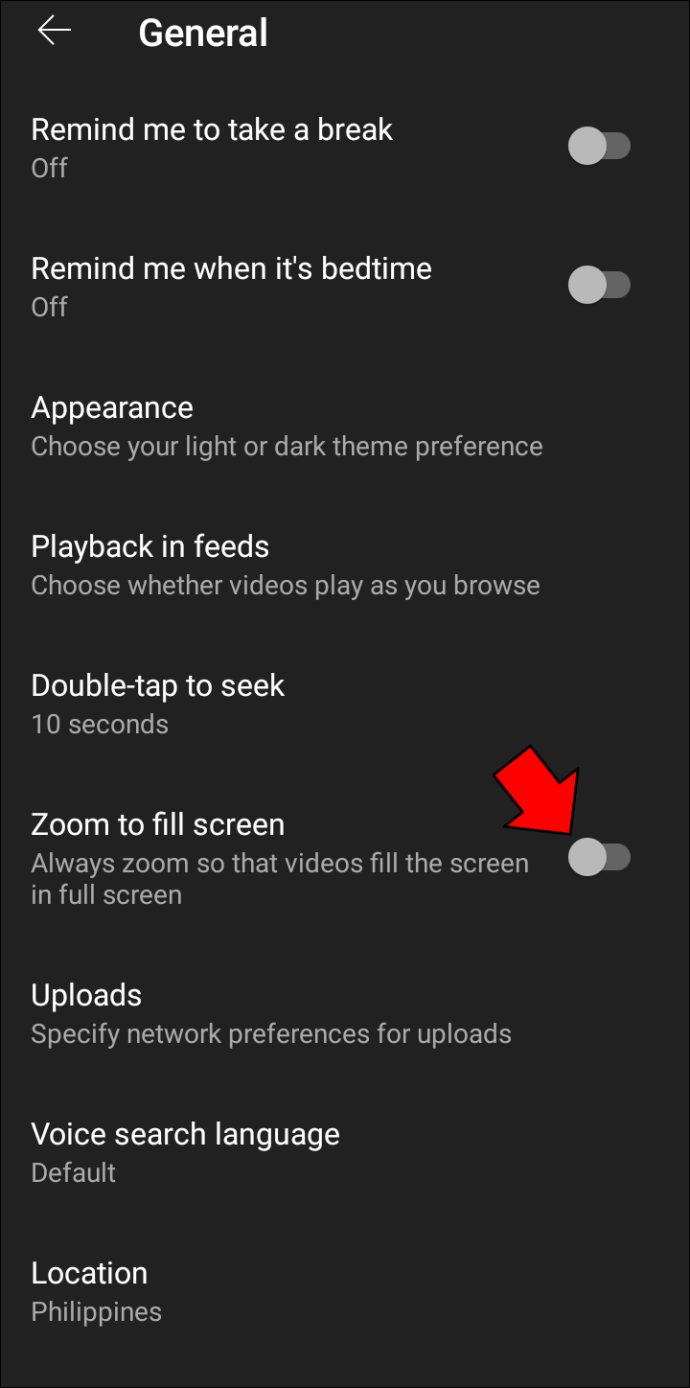 Bytt av/på-knappen ved siden av «Zoom for å fylle skjermen.»Start appen på nytt og se om problemet er løst.
