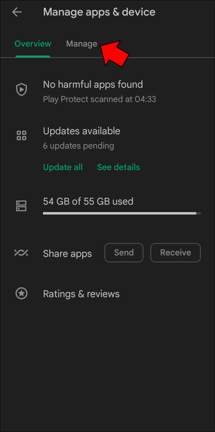 Gå til”Administrer”-fanen.Trykk på «Oppdateringer tilgjengelig.»
