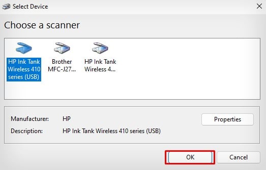 Wybierz drukarkę HP w następnym oknie i kliknij OK.